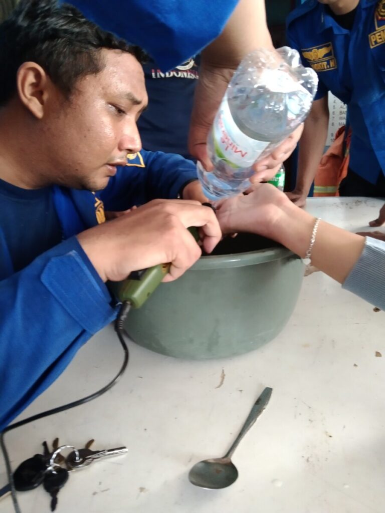 Damkar dan Penyelamatan SAT Pol PP Kota Metro melakukan giat yaitu membantu melepaskan cincin yang tersangkut di jari adek dari saudara Soni Aprindo .