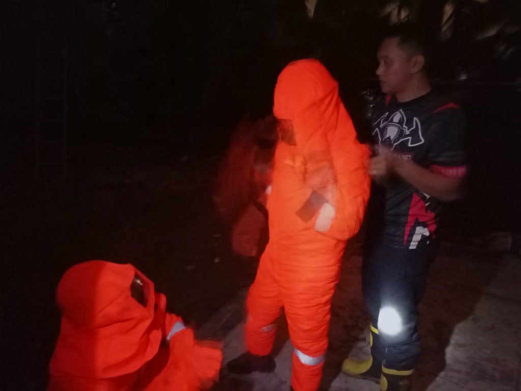 - Sesampainya di lokasi pukul 17:00WIB satgas damkar melihat kondisi TKP. Setelah di cek, kondisi tidak memungkinan untuk melakukan evakuasi pada saat itu juga,Sehingga evakuasi ditunda hingga malam hari.