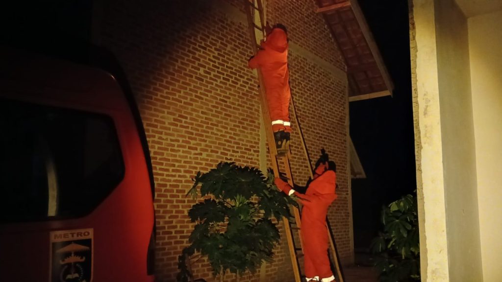 Damkar dan Penyelamatan SAT POL PP Kota Metro mendapat laporan perihal sarang Tawon yang berada di atap sebuah rumah.