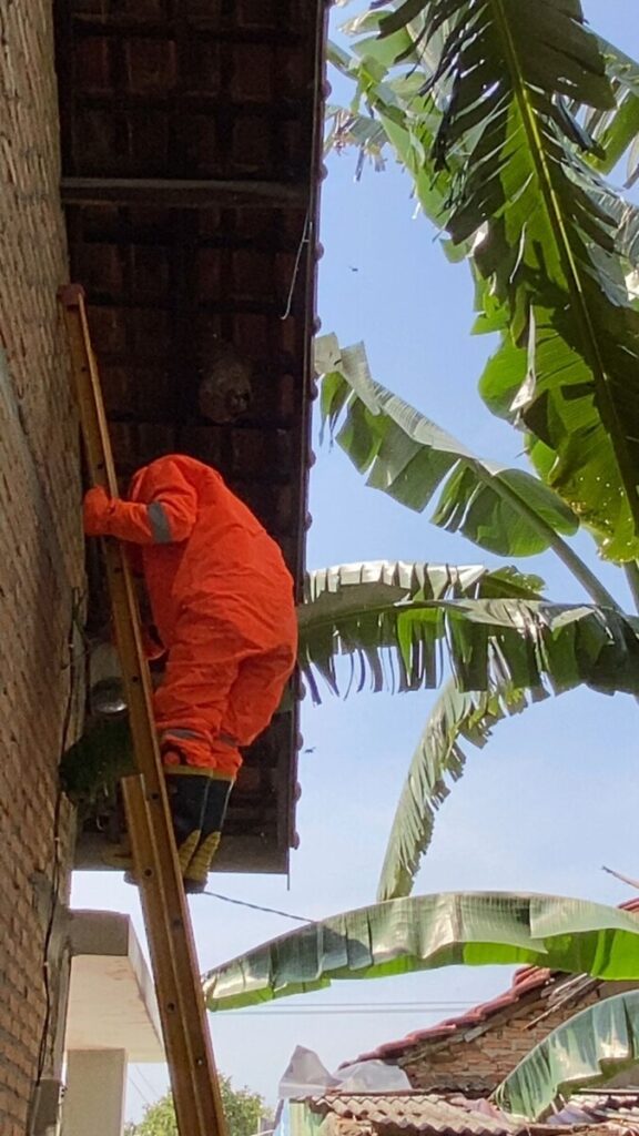 Damkar dan penyelamatan Sat Pol PP Kota Metro mendapat laporan prihal sarang tawon di atas rumah Bapak ian yang beralamat di:
