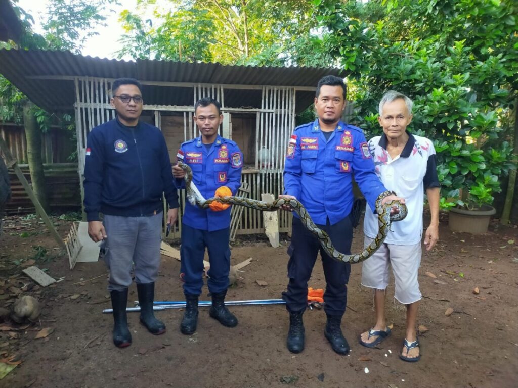 Damkar dan Penyelamatan SAT Pol PP Kota Metro mendapat laporan perihal tentang ular jenis piton yang berada di kandang ayam rumah milik bapak frans yang beralamatkan di : Jl. Wolter mongosidi gg.kucing Kelurahan hadimulyo timur, Kecamatan Metro pusat, Kota Metro.