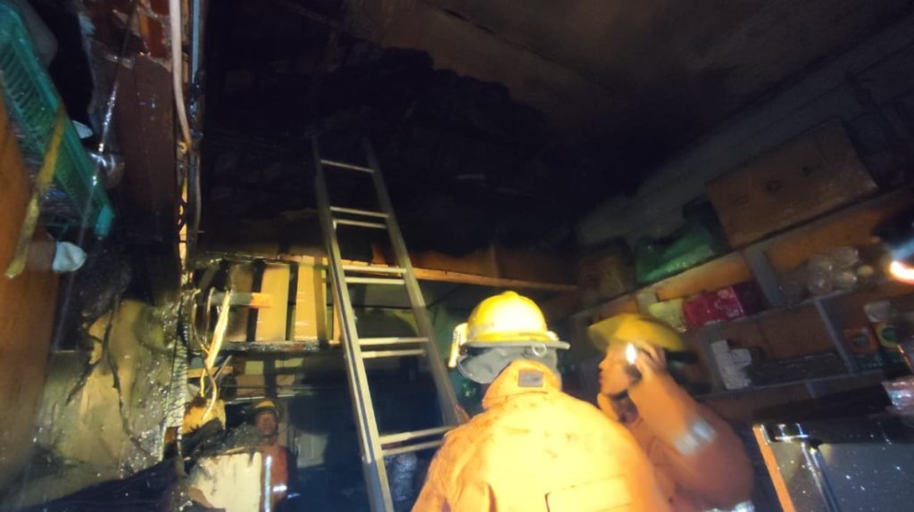 - Setelah di cek terdapat nyala api dari colokan kabel listrik yang sudah merambat ke plafon dan beberapa sembako di warung tersebut.