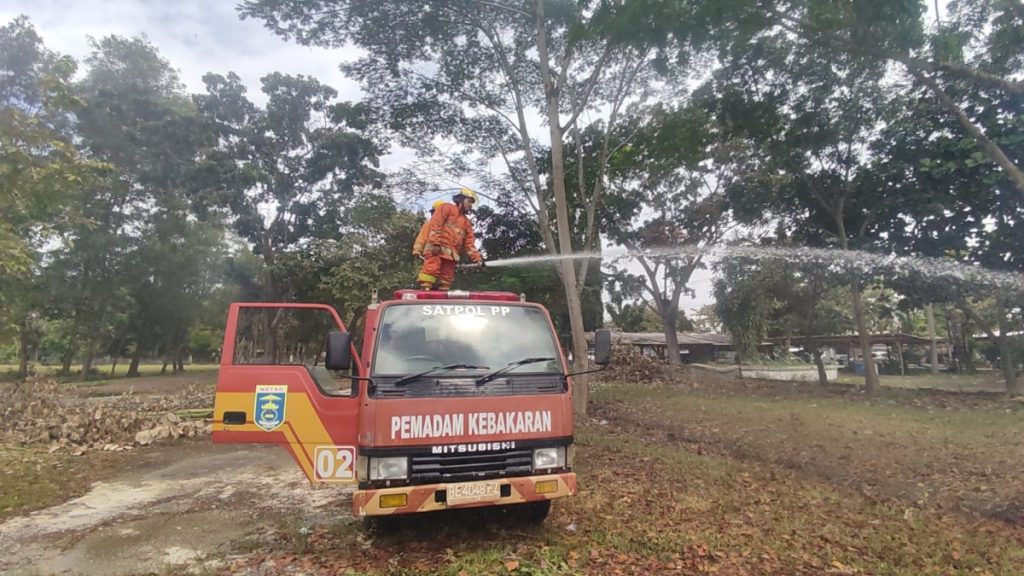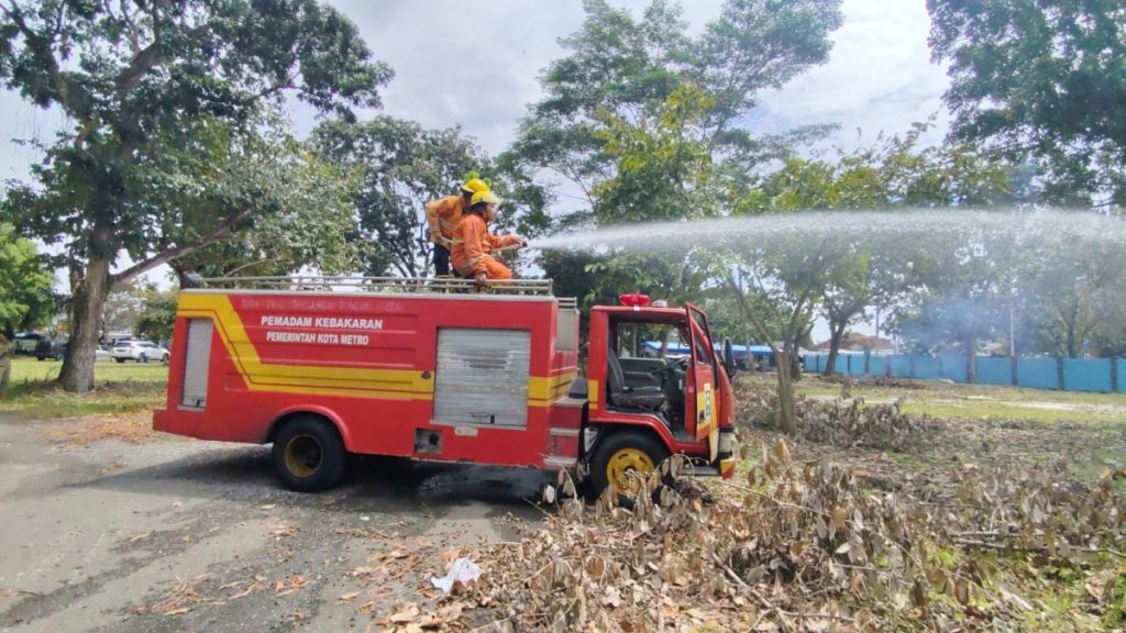 Satgas Damkar dan Penyelamatan SAT Pol PP Kota Metro mendapat laporan perihal kebakaran tumpukan kayu dan dedaunan yang beralamatkan di: Jl Yos Sudarso, Kelurahan Mulyojati , Kecamatan Metro Barat